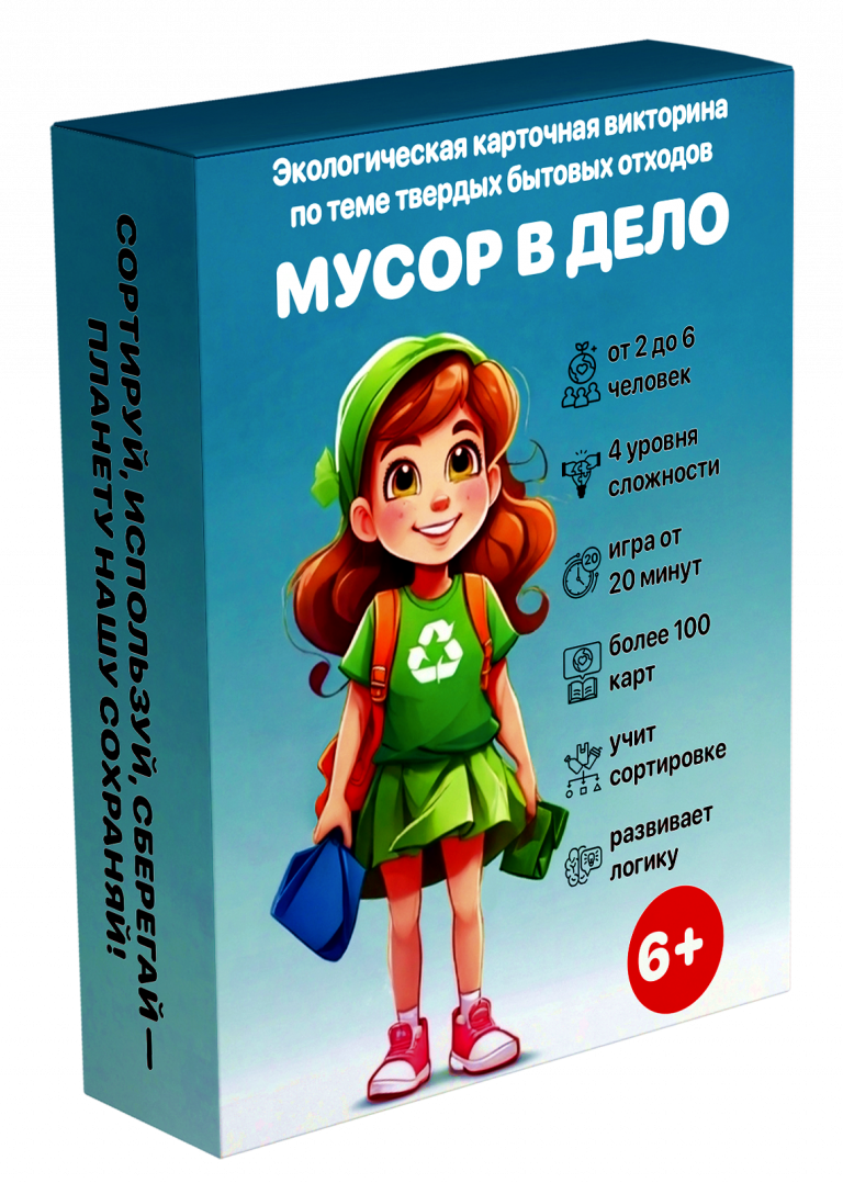«Мусор в дело» — настольная карточная викторина, разработанная для формирования практических навыков рационального обращения с твердыми коммунальными отходами. Игра ориентирована на студентов, школьников, а также всех желающих. Проводится в командном формате.